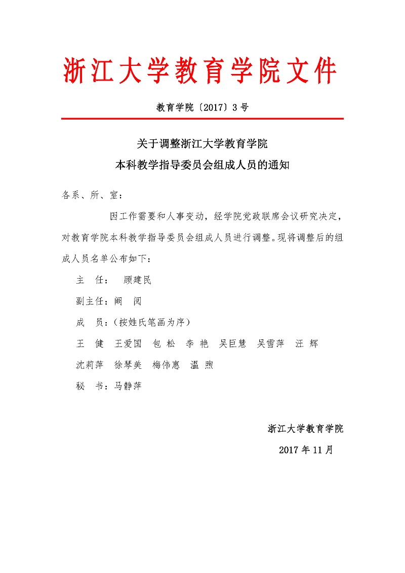 教育学院〔2017〕3号:关于调整浙江大学教育学院本科教学指导委员会组成人员的通...