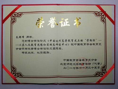 2017年11月24-25日,在北京师范大学教育学部主办、北京师范大学教育历史与文化研究院承办的2017年全国教育史学科发展研讨会上,中国教育学会教育史分会第三届优秀博士学位论文评选结果揭晓,我院2016届教育史专业毕业生朱鲜峰的博士学位论文《中国近代高等教育史上的“学衡派”——以其人文教育思想和实践为研究中心》(指导教师:肖朗教授)荣获优秀博士学位论文奖提名。