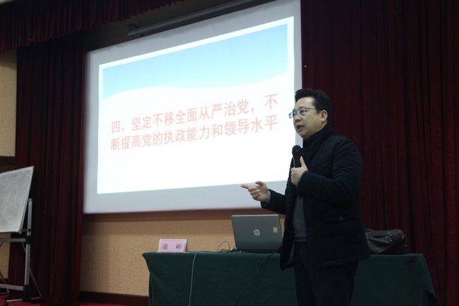 省委党校党史党建教研部副主任徐彬教授作了题为《迈向新时代新征程中国共产党的伟大政治宣言和行动纲领》的报告,他指出,学习十九大报告,要从政治上、思想上、理论上、实践上等多方面来深刻认识报告的重要意义。徐彬教授着重强调,要坚定不移全面从严治党,不断提高党的执政能力和领导水平。结合现实案例,徐教授阐释了坚持党的领导的重要性,认为要坚持党对一切工作的领导,要坚持国家治理体系和治理能力的现代化,坚持以人民为中心、坚持全面依法治国,发挥社会主义协商民主的重要作用。