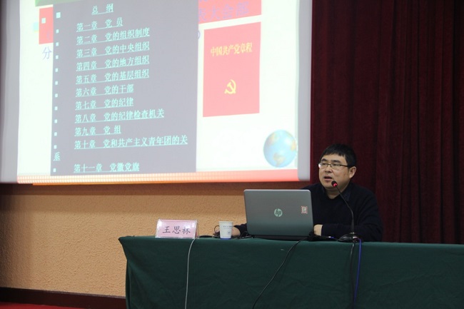 省委党校党史党建教研部王思林副教授以《不忘初心 牢记使命--中国共产党新党章解读》为主题,结合党史讲述了历次党章的修改背景、原因、内容和历史贡献。随后,他介绍了十九大党章的修改原因以及修改的五大逻辑、三大主线,认为此次党章修改体现了政治纲领和组织章程相结合、组织性和纪律性相统一、实体性和程序性相结合,新党章中党的领导与人民中心思想贯彻始终,习近平新时代中国特色社会主义思想贯彻始终。最后,王思林副教授强调,“学习党章是全体党员的基本功,这个功课要经常做。学习党章不仅要原原本本学、反反复复学,做到知其然,而且要联系实际学、深入思考学,做到知其所以然。”
