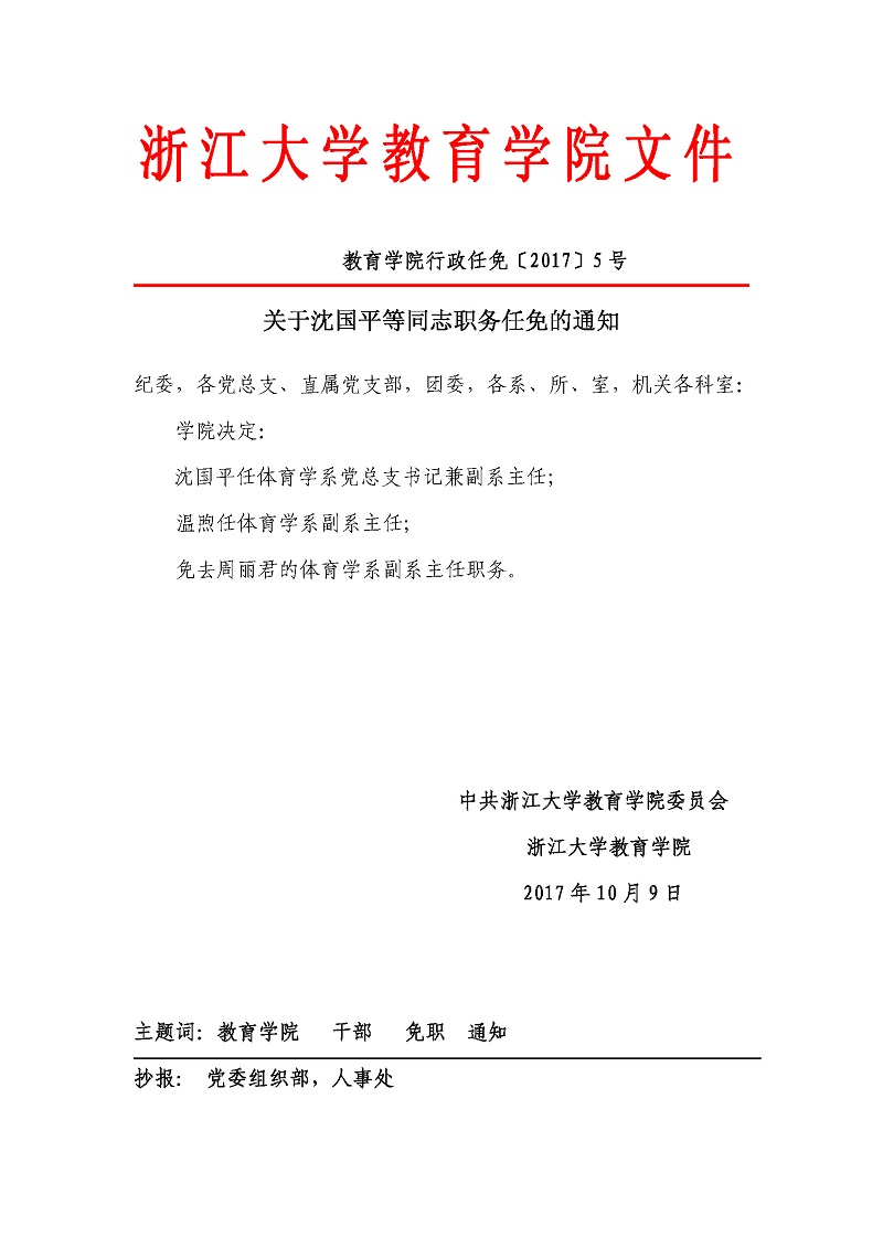 教育学院行政任〔2017〕5号:关于沈国平等同志职务任免的通知