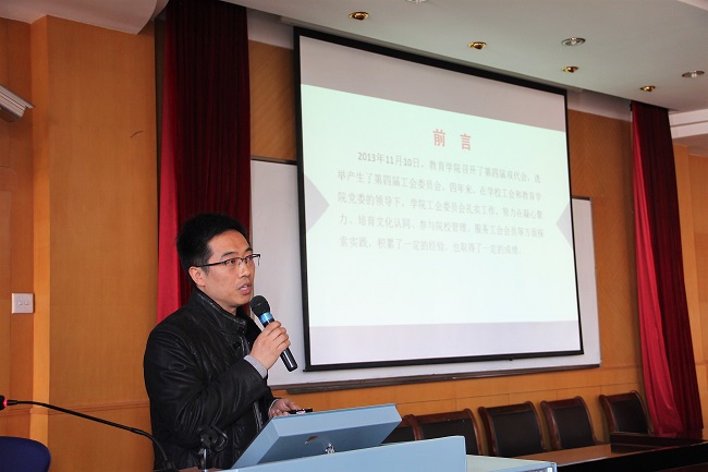 大会正式会议在庄严的国歌声中开幕,共14项议程,由学院党委书记吴巨慧主持。林俐老师代表校工会向大会的召开表示祝贺,肯定了教育学院在教学、科研、人才培养、师资队伍建设等各方面取得的成绩,并赞扬了教育学院工会长期以来所做的贡献。同时对学院工会继续履行职责,做好教职工的“娘家人”,尽心竭力为教职工办实事、做好事、解难事提出了要求和希望。