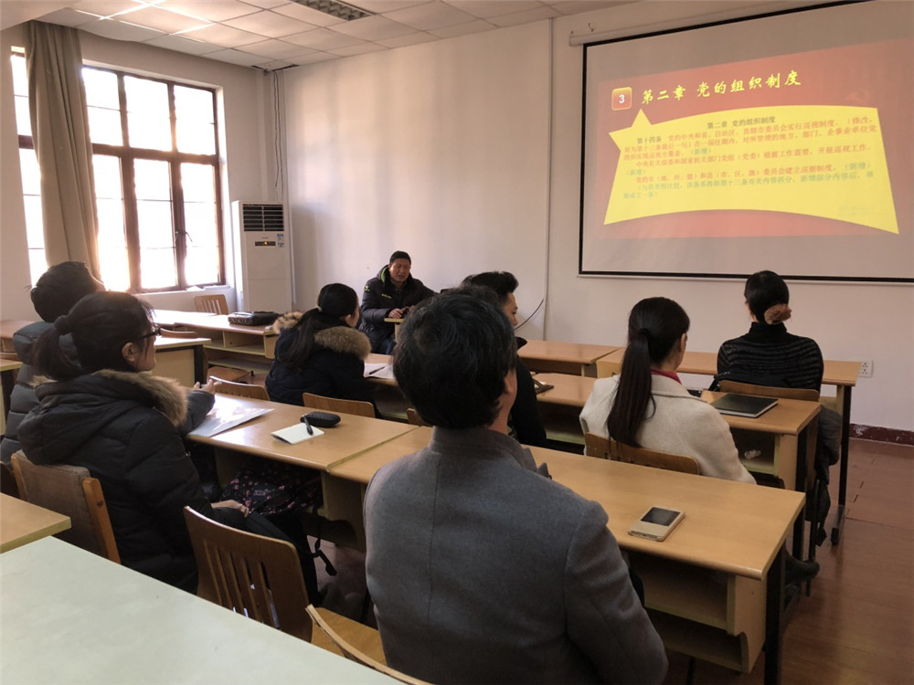为深入学习贯彻十九大精神,帮助师生党员学习理解新《党章》,2017年12月22日中午,体育学系教工术科支部与体育学系本科生支部在西二教学楼224开展联合党课学习,由学院党委委员、系总支书记沈国平老师作“新党章解读”党课,师生党员16人到会聆听。