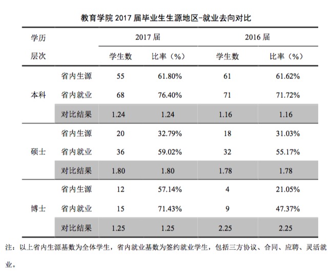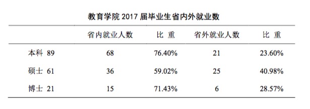 2017年,教育学院硕士毕业生国内升学人数为5人,比率为8.2%。其中包括浙江大学4人,北京师范大学1人。