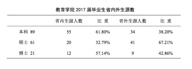 2017年,教育学院应届毕业生171人,其中本科毕业生89人,硕士毕业生61人,博士毕业生21人,主要分布在5个本科专业、12个研究生专业。