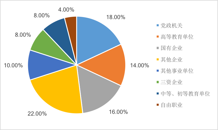 在单位性质方面,硕士研究生主要流向其他企业、党政机关和国有企业。此外,也有较多毕业生流向了高等教育单位。