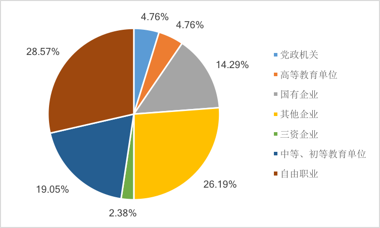 本科生主要的就业单位性质为自由职业与其他企业,初中等教育单位也占有较大的比例。