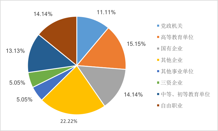 在单位性质方面,硕士研究生主要流向其他企业、党政机关和国有企业。此外,也有较多毕业生流向了高等教育单位。