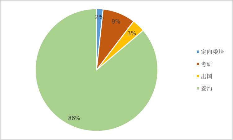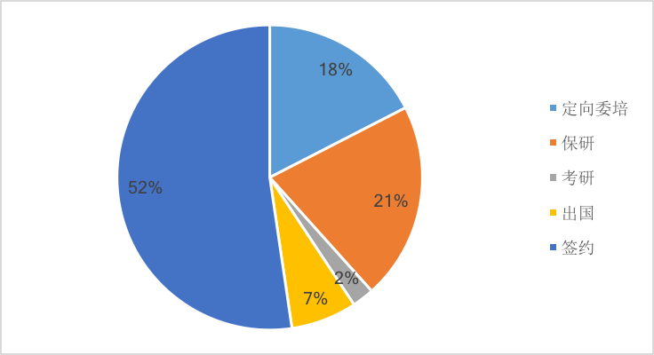 硕士生中,绝大部分同学选择以签约就业落实毕业去向,有5人选择考博,在国内升学。