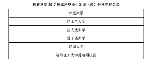 2017年,教育学院硕士毕业生国内升学人数为5人,比率为8.2%。其中包括浙江大学4人,北京师范大学1人。