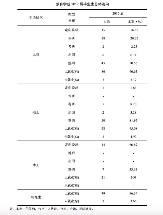 在就业大体流向上,教育学院2017届本科生主要以签约就业、升学、定向委培等方式落实毕业去向,升学人数中保研占绝大多数。