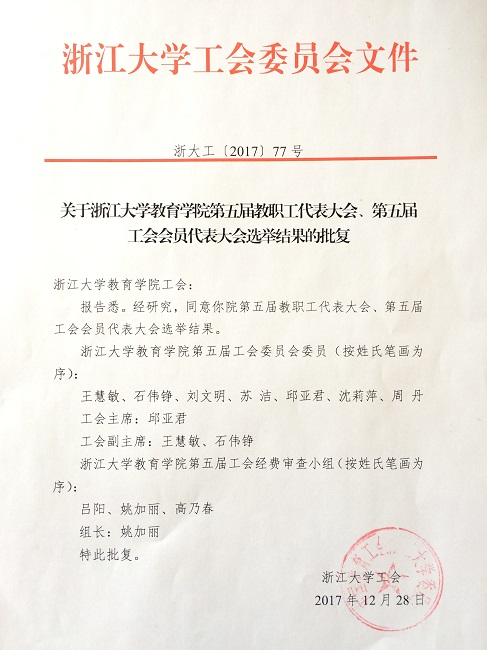 校工会关于浙江大学教育学院第五届教职工代表大会、第五届工会会员代表大会选举结果的批复