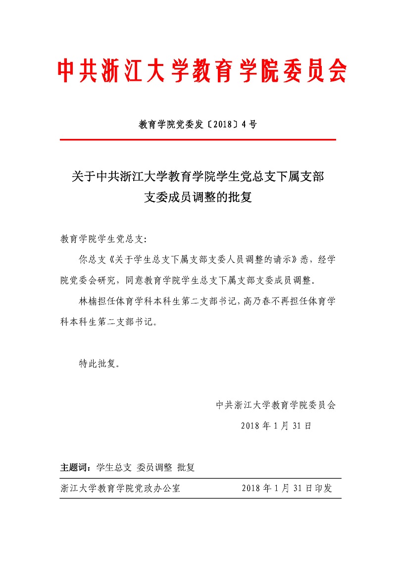 教育学院党委发〔2018〕4号:关于中共浙江大学教育学院学生党总支下属支部支委成员调整的批复