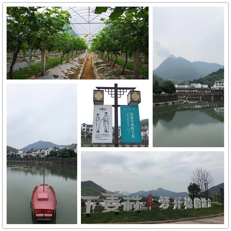 甫入村口,支部党员们就看到了一垄垄透明大棚,晶莹饱满的葡萄已挂上枝头。行走沿江步道上,青山如黛、绿水如腰,掩映在绿树丛中的一栋栋或三层、或四层的乳白色楼房,显得更加洁净端庄。然而在上世纪七八十年代,这里却是另外一番景象:急于摆脱贫困的村民纷纷上山砍树,浓烟滚滚的木炭窑让整个村庄烟雾缭绕,村里的山林资源迅速减少。街道是坑坑洼洼的泥巴路,再加上家家户户散养生猪,整个村臭气弥漫、污水横流。2003年,下姜村沼气建设项目得到了政府的大力支持,这也成为了下姜生态环境保护的转折点。这些年来,在下姜村,绿水青山就是金山银山得到了有效实践,绿色生态成为了第一生产力。近年来,村民顺应市场需求,开始由蚕桑叶、茶叶等传统种植业逐渐转向更高附加值的规模农业和养殖业。在村委会推动下,下姜村建成了葡萄园、草莓园、中药材园等几大产业园区,还搞起了规模化养殖。环境好了、公路通了,越来越多的游客慕名而来。下姜村顺势而为,打造景点式村庄,充分发掘当地传统文化的魅力。