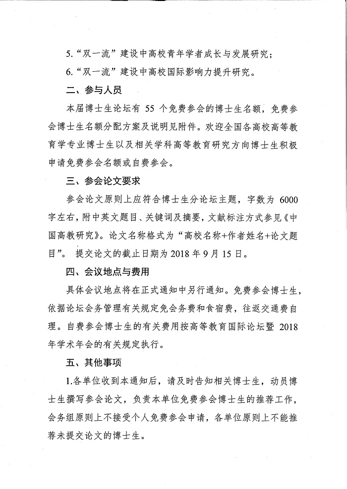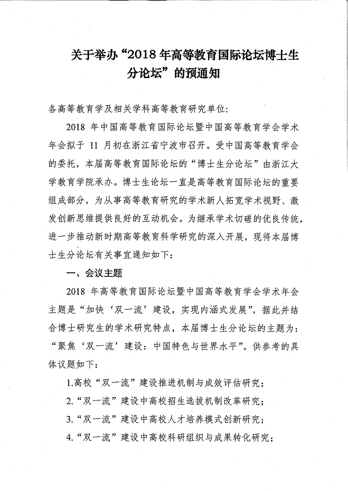 关于举办“2018年高等教育国际论坛博士生分论坛”的预通知