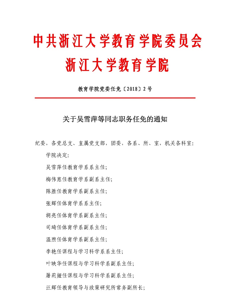 教育学院党委任免〔2018〕2号:关于吴雪萍等同志职务任免的通知