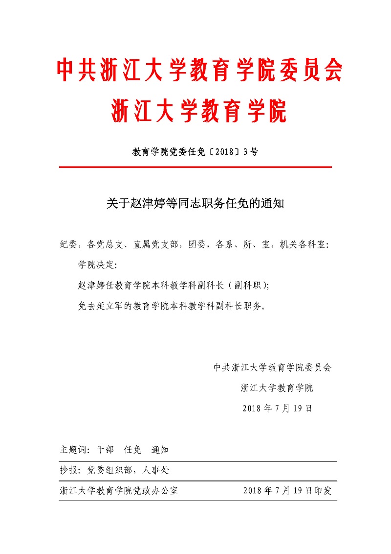 教育学院党委任免〔2018〕3号:关于赵津婷等通知职务任免的通知