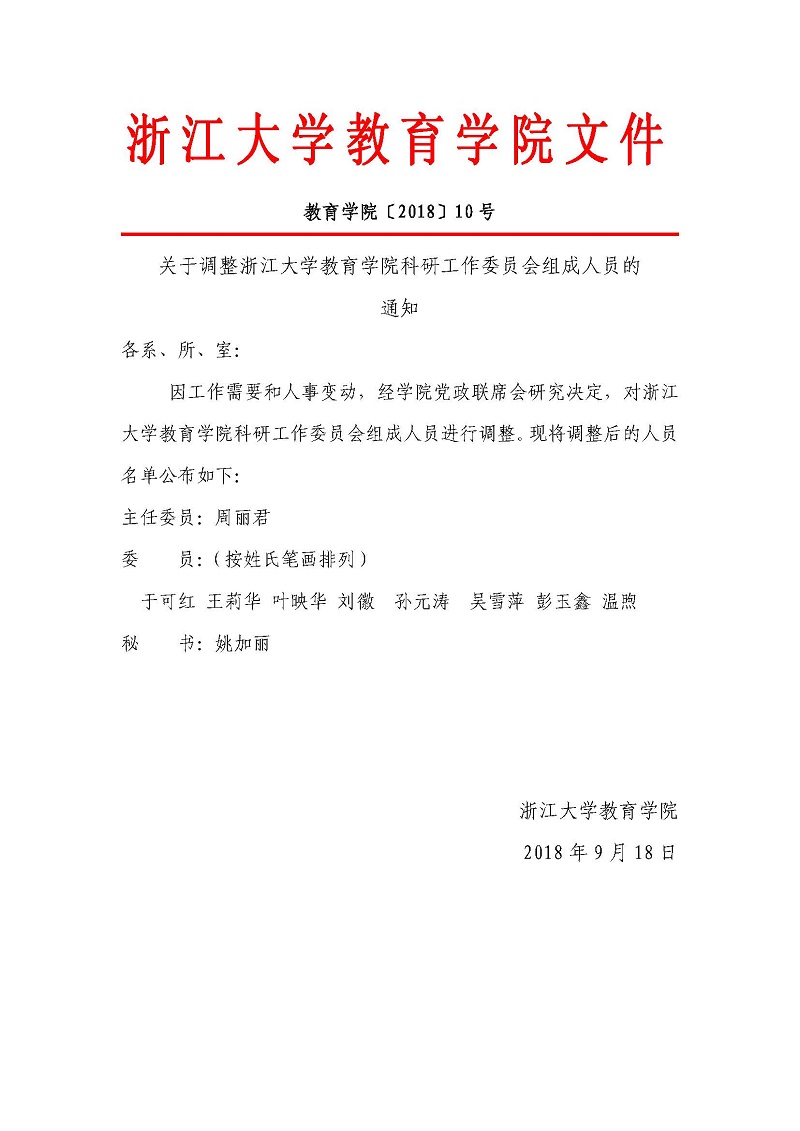 教育学院〔2018〕10号:关于调整浙江大学教育学院科研工作委员会组成人员的通知