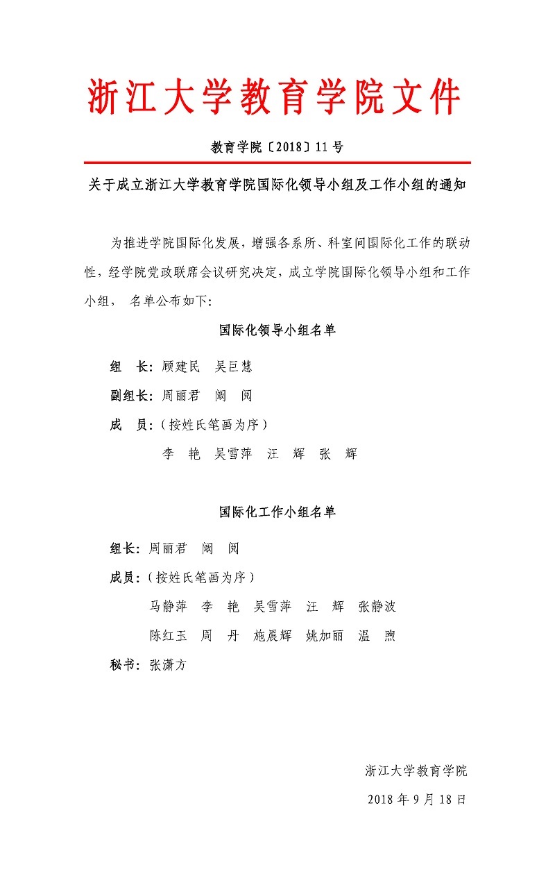 教育学院〔2018〕11号:关于调整浙江大学教育学院国际化领导小组及工作小组的通知
