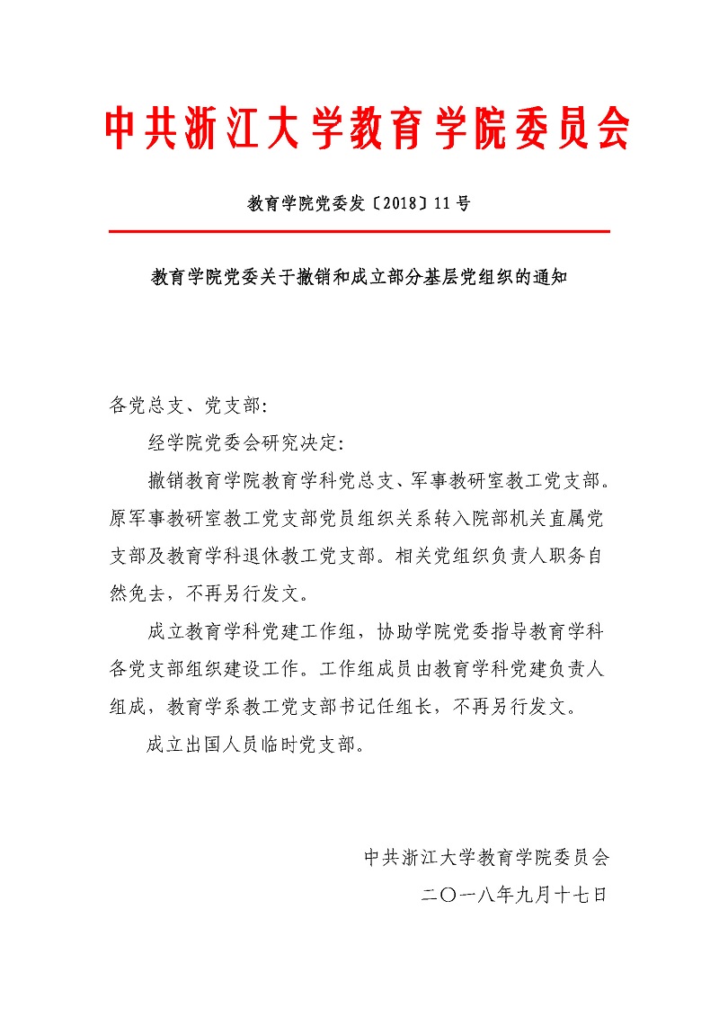 教育学院党委发〔2018〕11号:教育学院党委关于撤销和成立部分基层党组织的通知