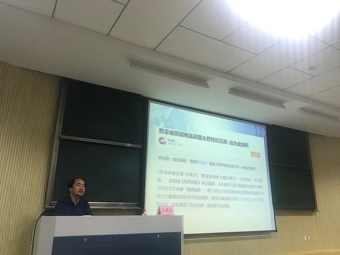 接着,由马克思主义学院的汪剑达副教授先我们讲解马克思主义宗教观,该讲座主要包括三个内容,分别是“为什么要重视宗教问题”、“马克思主义宗教观的若干观点”和“马克思主义宗教观的中国化”。汪剑达副教授结合国际时事和历史对马克思主义宗教观进行了阐释,使同学们对马克思主义宗教观有了进一步的认识。