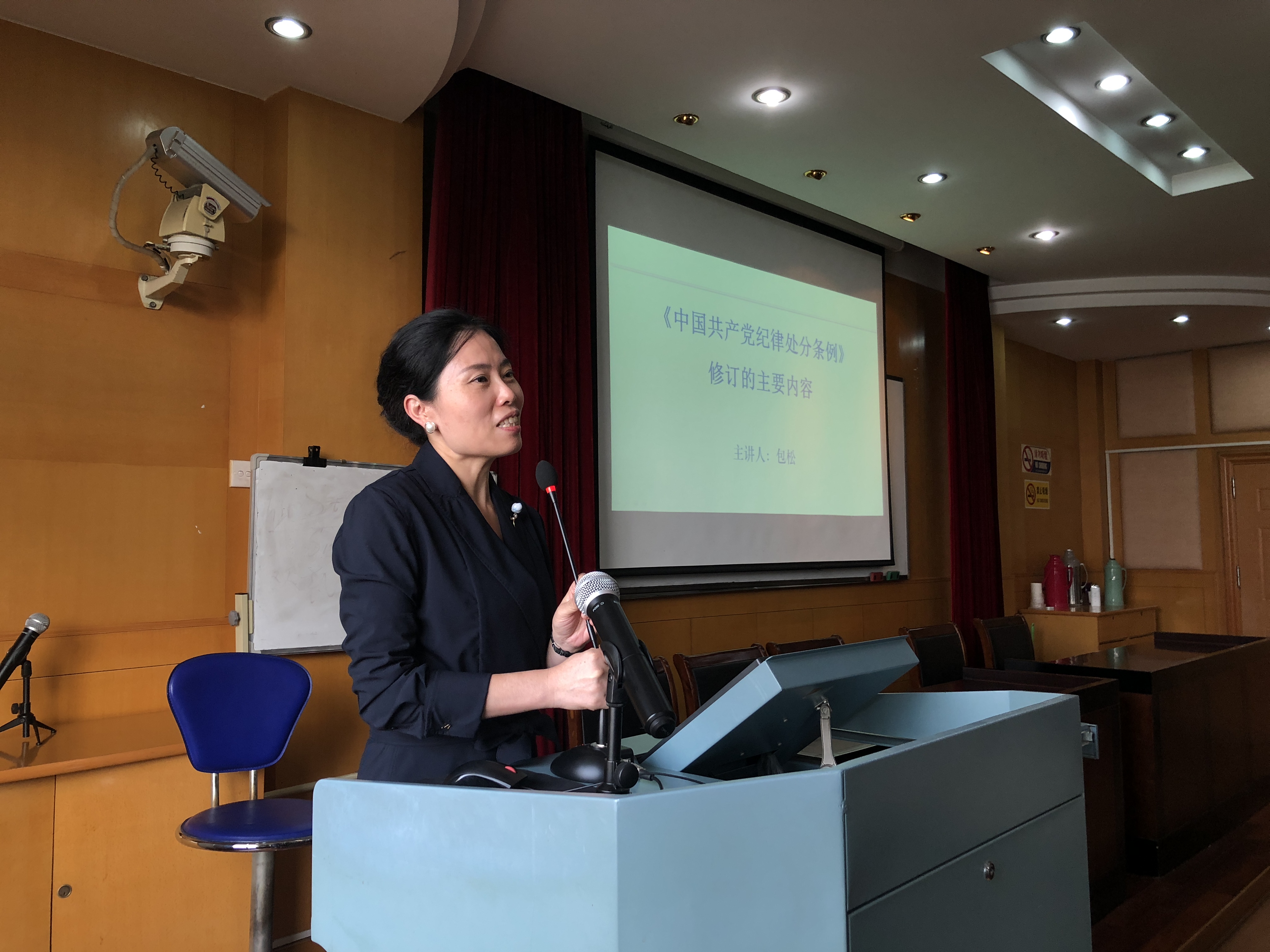 学院党委副书记、纪委书记包松解读了新修订的《中国共产党纪律处分条例》。她将新修订的《条例》与2015年版的《条例》进行对比,从总则、政治纪律、组织纪律、廉洁纪律、群众纪律、工作纪律、生活纪律等方面全面解读了《条例》修订的主要内容。她强调指出,《条例》的修订体现了党中央坚持不懈、持之以恒将全面从严治党推向纵深的坚定决心和担当精神,向全党释放了全面从严治党永远在路上的强烈信号。全院师生都应深刻领会《条例》修订的重要意义,准确把握条例的重点,深刻领会每条规定的内涵,在日常工作与生活中自觉遵守和维护党的纪律。