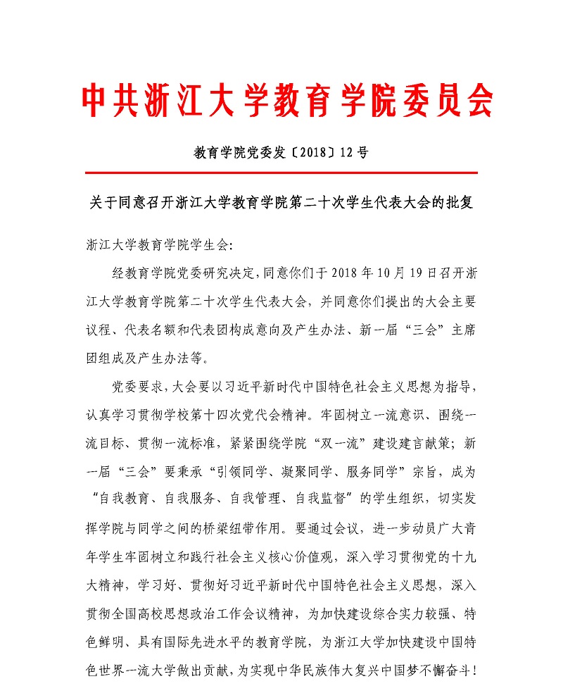 教育学院党委发〔2018〕12号:关于同意召开浙江大学教育学院第二十次学生代表大会的批复