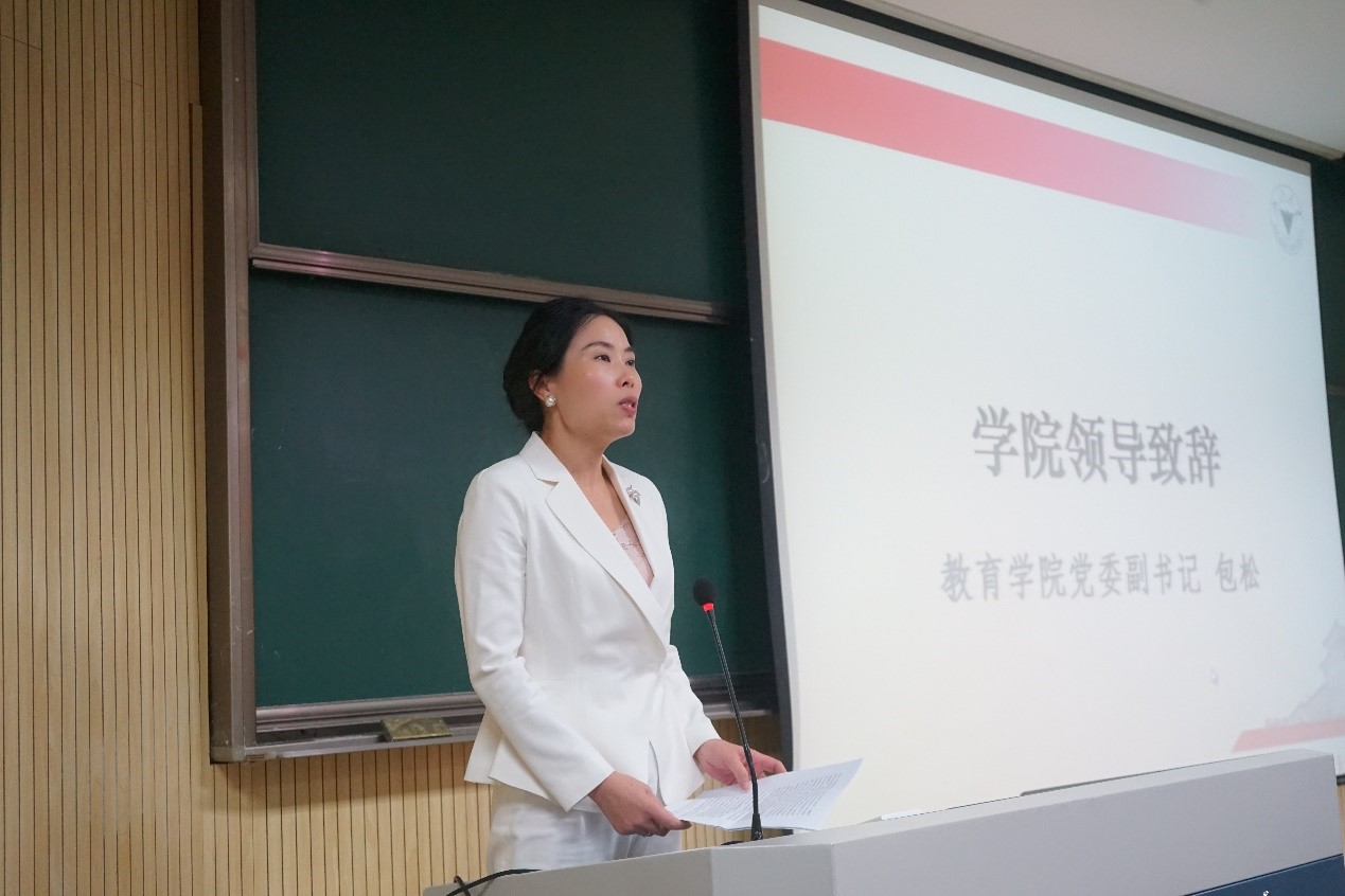 会议在庄严的国歌声中拉开序幕。学院党委副书记包松老师首先上台致辞。包书记首先肯定了教育学院学生会、研博会上一年中取得的丰硕成果。三会在院党委的科学领导、院团委的悉心指导下,努力工作,奋发有为,为促进教育学院青年学生成长成才做出了积极的工作。包书记还向二十届三会成员提出了三个问题:为什么来做学生干部?做一个什么样的学生干部?怎么成为高素质的学生干部?她指出,选择成为一名学生干部,不是为了做官,有炫耀的资本,而是在更高平台上来锻炼成长自己;学生干部应该热爱祖国,心怀人民,全面发展;应该坚定理想信念、扎根同学、真正接触理论;应该真正走进社会,观察重大社会问题。包书记话里行间充满了对教育学院三会未来发展的殷切期盼,也点明了三会人未来前进的方向,使在场每一位同学都深有感触。