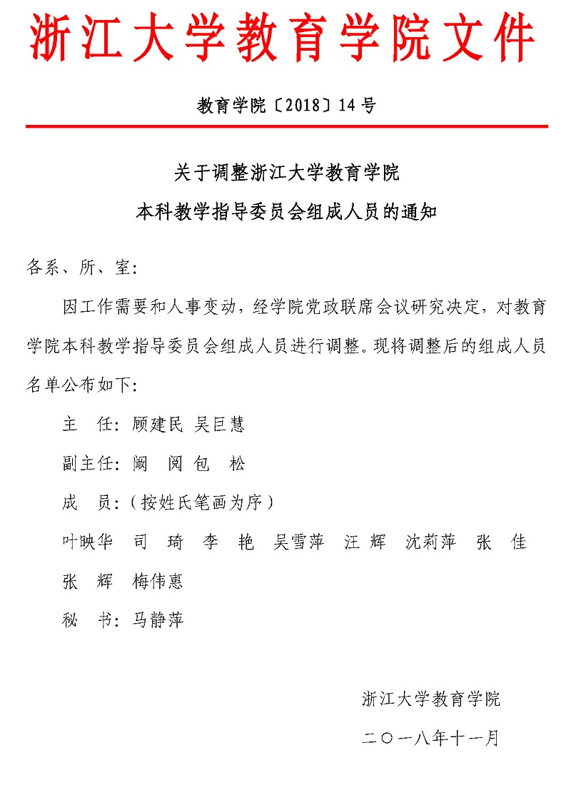 教育学院〔2018〕14号:关于调整浙江大学教育学院本科教学指导委员会组成人员的...