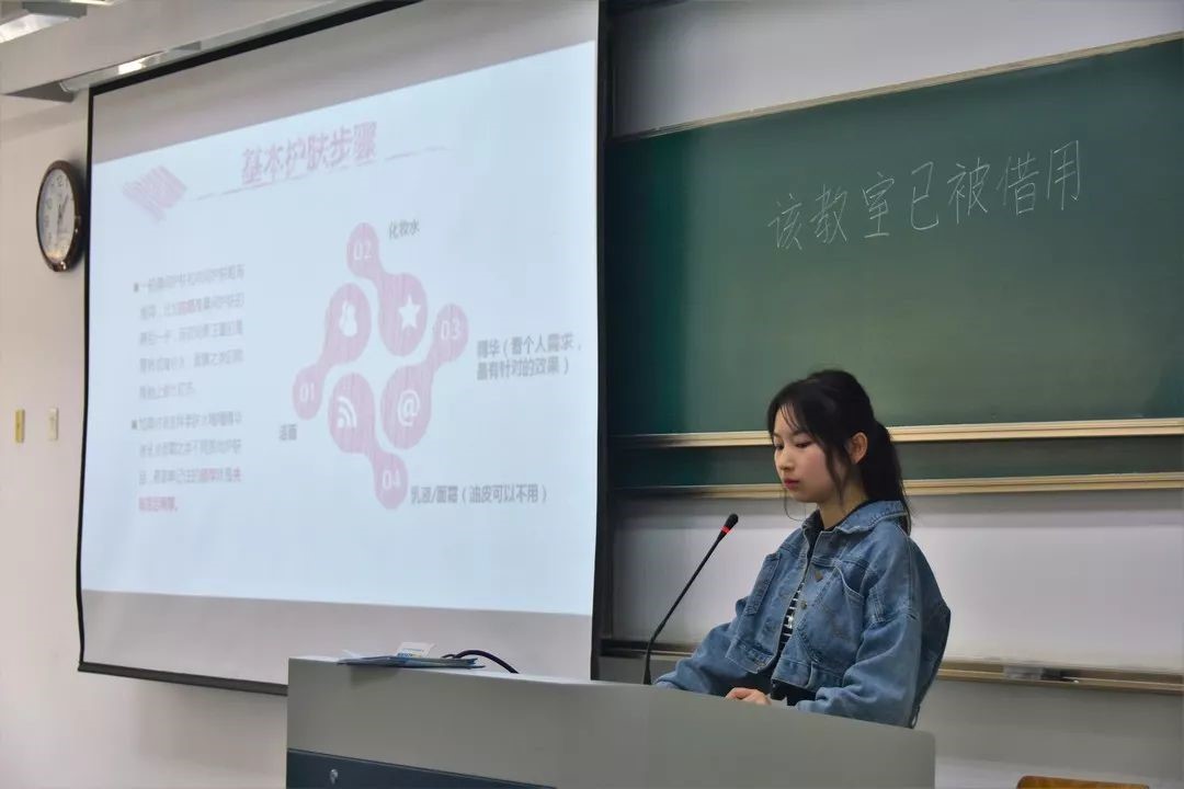 第二部分内容由浙江大学礼仪协会副会长李千如为我们授课,主题为化妆礼仪。她以化妆的意义、护肤、美妆、化妆的礼仪四块内容展开,在护肤方面,她为我们介绍了肤质的类型、基本护肤步骤,解释了过去我们在护肤知识存在的误区。此外,她重点讲述了美妆内容,分顺序一一介绍,给学生会的化妆小白们带来了详细教程。成员们积极互动,内训过程轻松愉快。最后,李千如讲师还亲自为甄丹蕾同学化妆,让我们感受到了化妆的神奇之处。