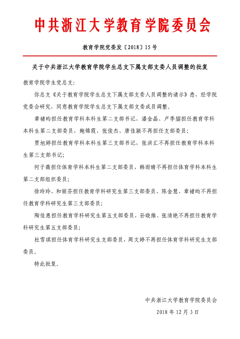 教育学院党委发〔2018〕15号:关于中共浙江大学教育学院学生总支下属支部支委人员调整的批复