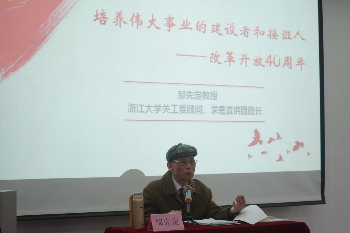邹先定教授带来题为《培养伟大事业的建设者和接班人——改革开放40周年》的主题党课。2018年是贯彻党的十九大精神的开局之年,是改革开放40周年,也是浙江大学扬帆新甲子的奋进之年。首先,邹老师从不同的视野阐述了改革开放的历史成就和现实意义。其次,邹老师对青年学子提出期望,期望我们可以贯彻落实党的教育方针,提出了伟大事业的建设者和接班人所必需要有的素质和品格,并特意强调了体育锻炼的重要性,他认为,体育锻炼是培养强大的心理支持的好办法,并举了自己四十多年来风雨无阻进行锻炼的例子,让在场所有人都感同身受,并由衷折服赞叹。然后,邹老师放眼中外,纵观古今,进一步阐述了建设者和接班人的“任重和道远”。最后,邹老师以浙大校歌为很好的切入点,用朴素简洁精炼的语言,带领同学们在文辞古奥,含义深幽的歌词中探索、思考,“昔言求是,实启尔求真”——这正是党的根本宗旨“实事求是”;“何以新之,开物前民”——党应该引领人民奔向前方;“嗟尔髦士,尚其有闻”——党员应该有思想、有精神、有魄力,并最终有所获、有所得、有所行动、有所承当。通过对校歌的解读,学生们更加明确了浙大学子的使命和担当。