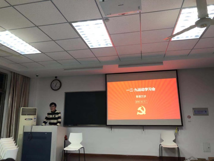 第二阶段,是由陈逸煊为组长的项目小组策划组织的“一二•九”主题学习暨“一二•九”红歌会活动。主讲人张恩铭以“一二•九运动学习会——青春万岁”为主题,和在场的同学们一起回顾了“一二•九”运动——中国共产党领导的一次大规模学生爱国运动。由田汉词、聂耳作曲于1934年的《毕业歌》,号召着当时的有为青年走上救亡图存道路,表达了一代青年“天下兴亡,匹夫有责”的爱国激情,也激发了在场同学们的满腔热血。本次主题学习,让大家对“一二•九”运动的事件起因、事件经过及其意义有所了解,也引发了同学们的思考——作为当代青年学生要如何以我们的爱国情怀和行为、我们的爱国激情与理性让这个文明和谐的国家更加美好。