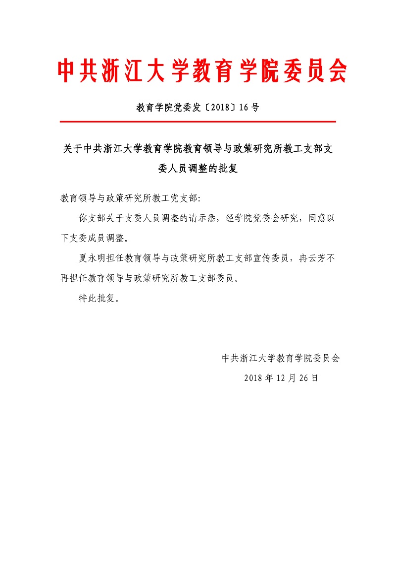 教育学院党委发〔2018〕16号:关于中共浙江大学教育学院教育领导与政策研究所教工支部支委人员调整的...