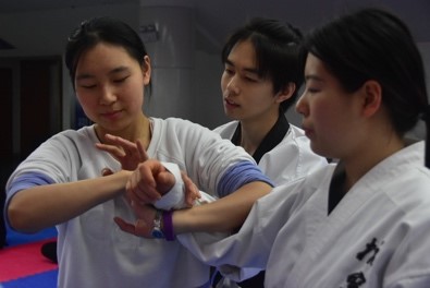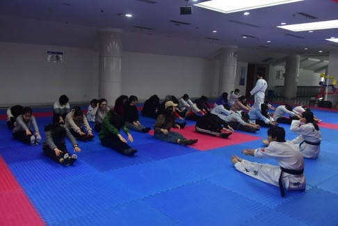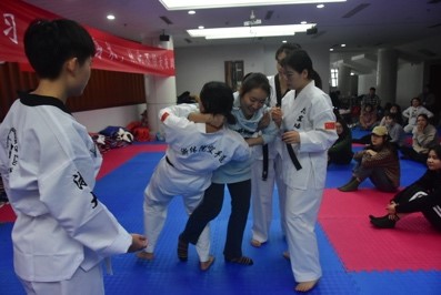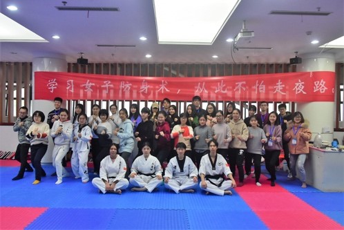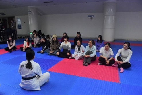 活动伊始,每一位受邀前来指导的女子防身术教练都做了简短的自我介绍,并在腰间系上了自身实力的证明——跆拳道黑带。看着醒目的黑带,相信前来参加活动的同学们在内心也早已肯定了他们。
