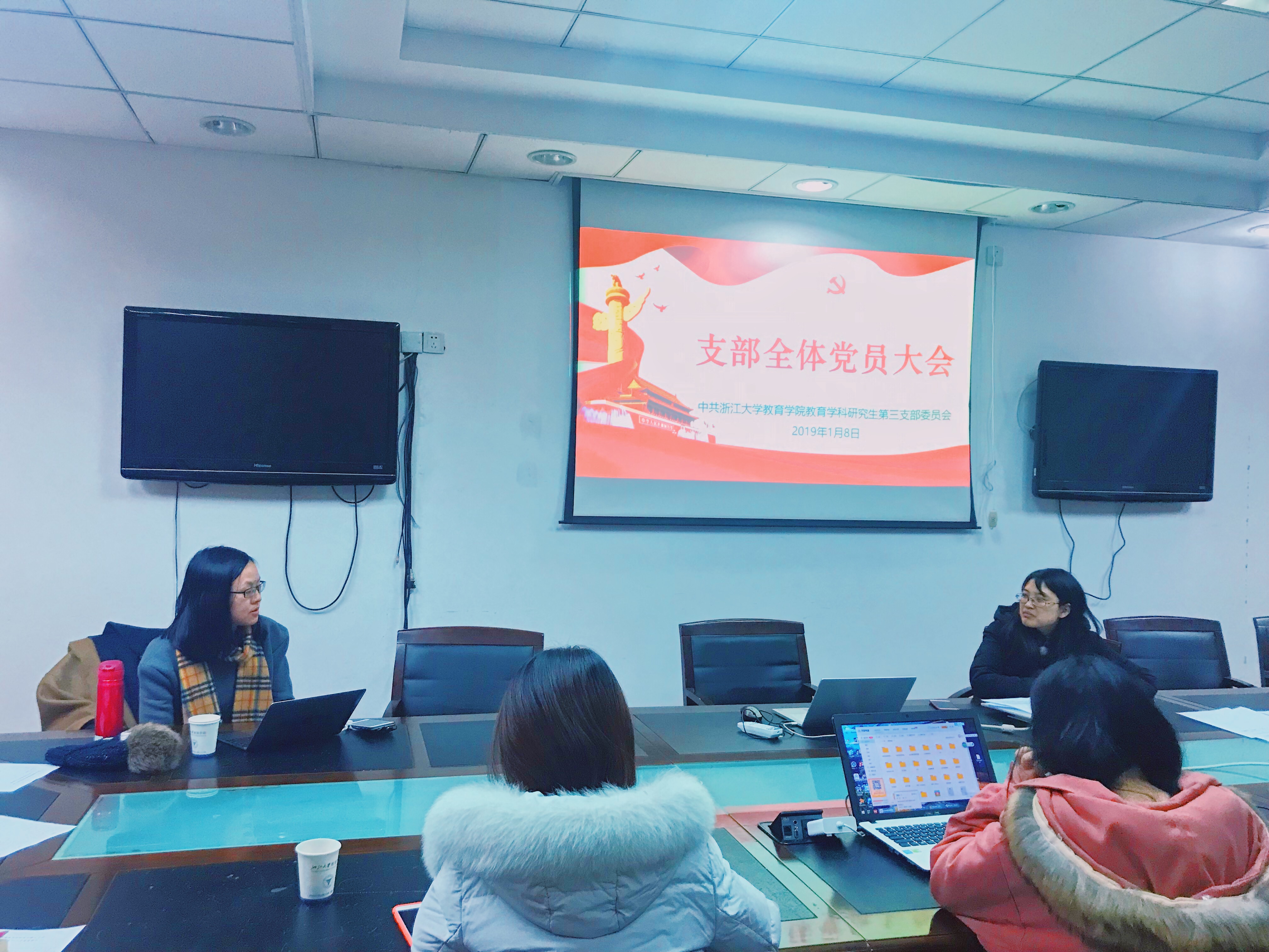为深入学习贯彻习近平新时代中国特色社会主义思想和党的十九大精神,全面落实新时代党的建设新要求,推进“两学一做”学习教育常态化制度化,2019年1月8日晚,浙江大学教育学院教育学科研究生第三支部在田家炳书院228会议室召开2018年度组织生活会,开展民主评议党员工作。浙江大学教育学院党委委员、教育学科研究生第三支部联系领导刘徽老师受邀参加本次会议,会议由教研三支部书记叶晨晨主持。