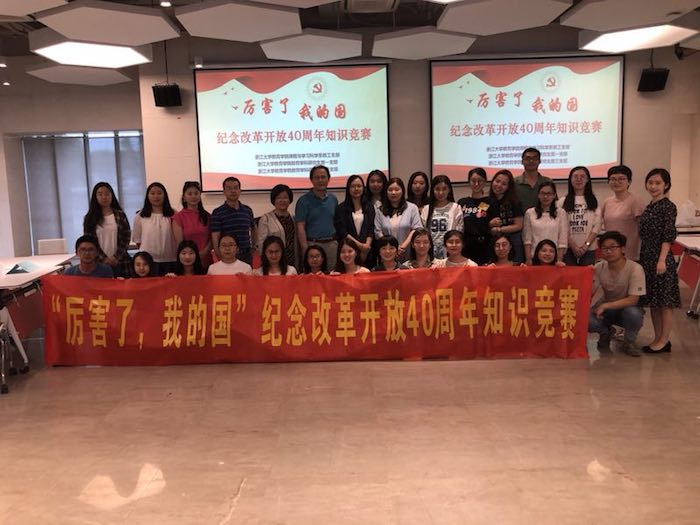 6月3日,支部联合课程与学习科学系教工支部、教育学科研究生第一支部、教育学科研究生第三支部开展师生支部共建活动,赴嘉兴开展纪念改革开放40周年学习实践活动。“厉害了,我的国”纪念改革开放40周年知识竞赛在浙江大学海宁国际校区进行。教研一支部、教研三支部的各位同学混合组队,通过“突围之战”、“肝胆相照”、“巅峰对决”三个环节的比拼,第2小组获一等奖、第1小组获二等奖、第3和第4小组获三等奖,课程系教工支部的老师们为获奖同学进行了颁奖。