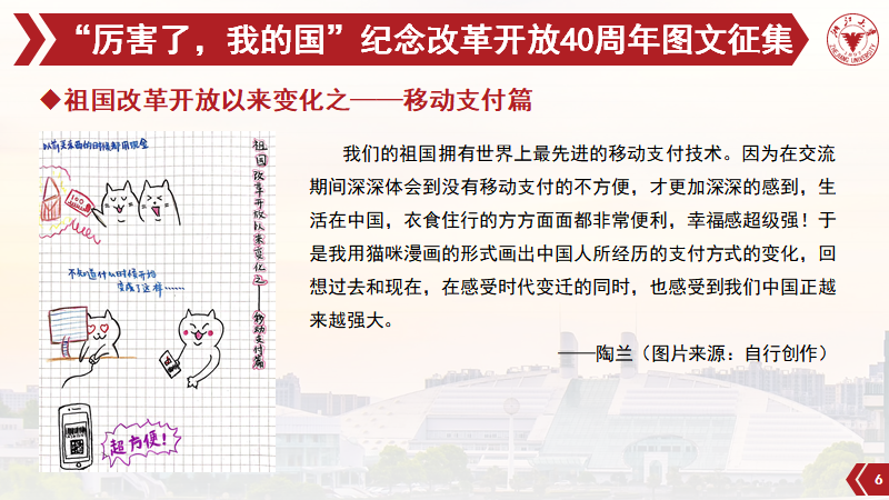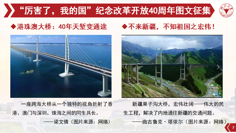 3月,“厉害了,我的国”纪念改革开放40周年图文征集活动拉开序幕;至2018年4月,经微信公众号线上投票、特邀评委评审打分方式,评选出了一等奖1名、二等奖2名、三等奖3名和最佳人气奖2名。教研三支部党员以及教硕1701团支部广大同学积极参与,以“一张图/一组图+一句话”的形式,深入挖掘体现改革开放40年以来中国沧桑巨变、伟大变革的场景。