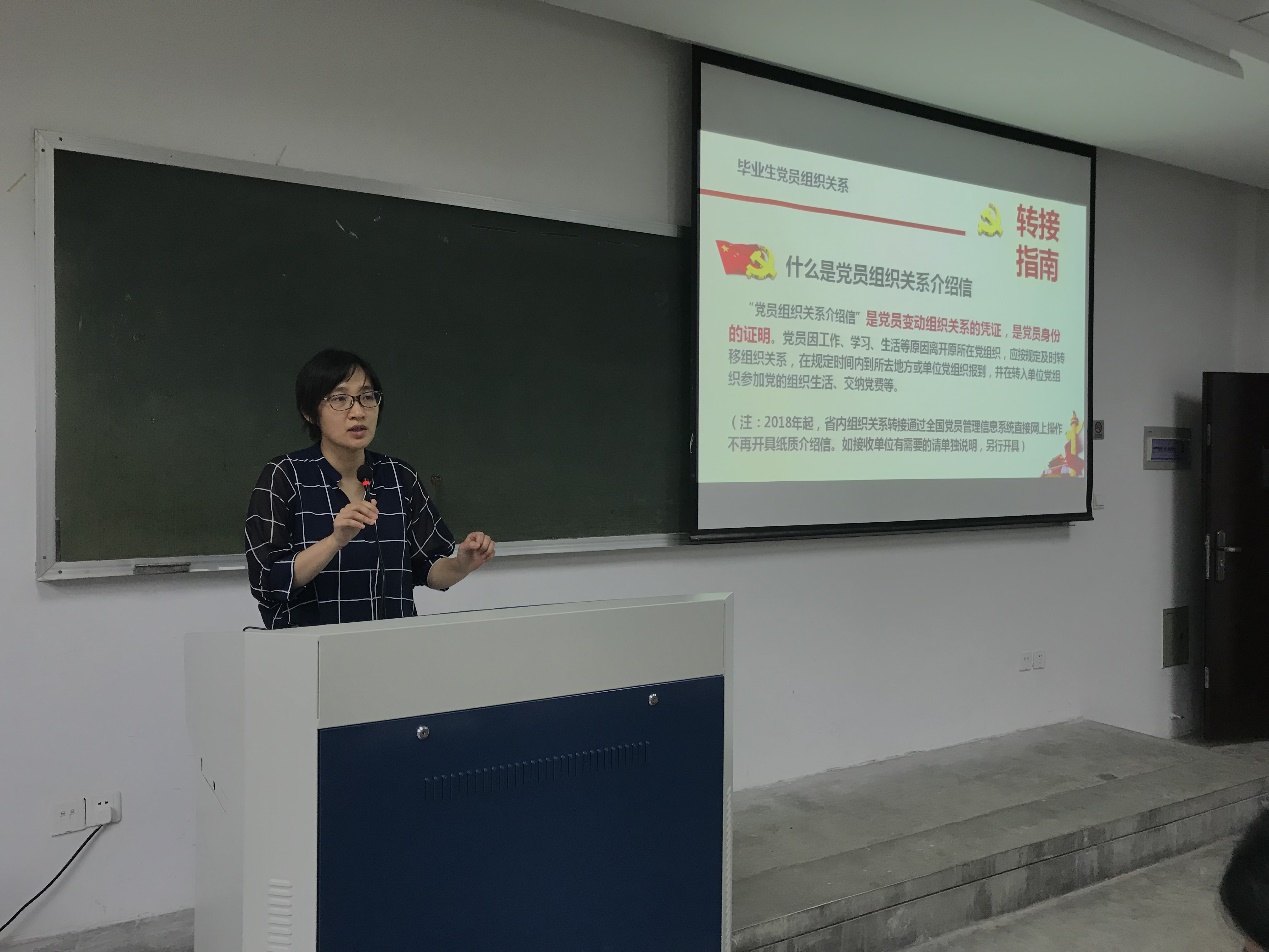 紧接着巫微涟老师就毕业生党员组织关系转接流程做了具体的说明,她先从党员组织关系、党员组织关系介绍信、党建档案等概念谈起,分别解释了去往本校本院、本校、浙江省内、和浙江省外四种党组织关系的转接,并着重强调了预备党员和出国留学党员的党组织关系转接中会出现的难点,最后当场对同学们遇到的相关疑惑做了进一步解答和说明。