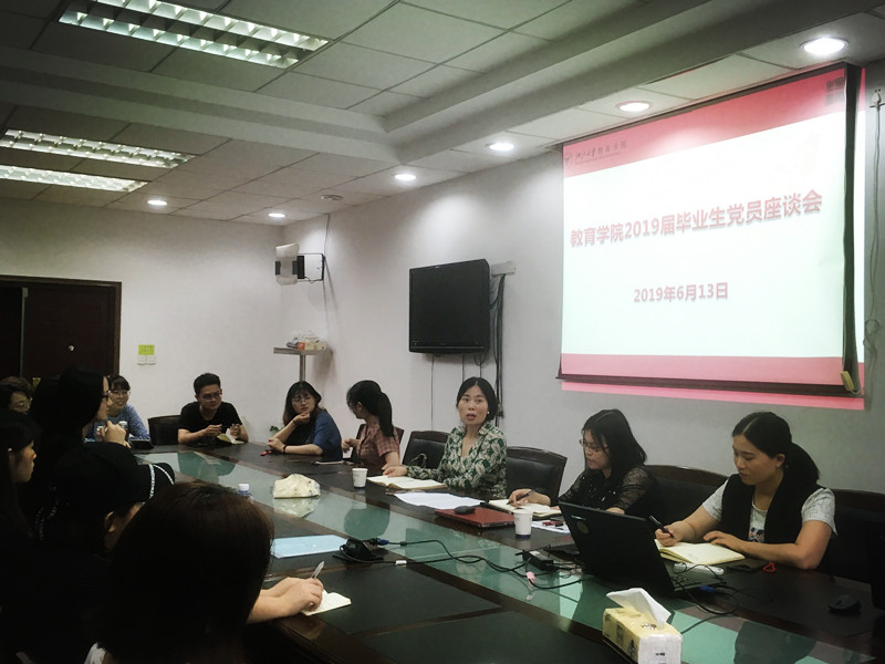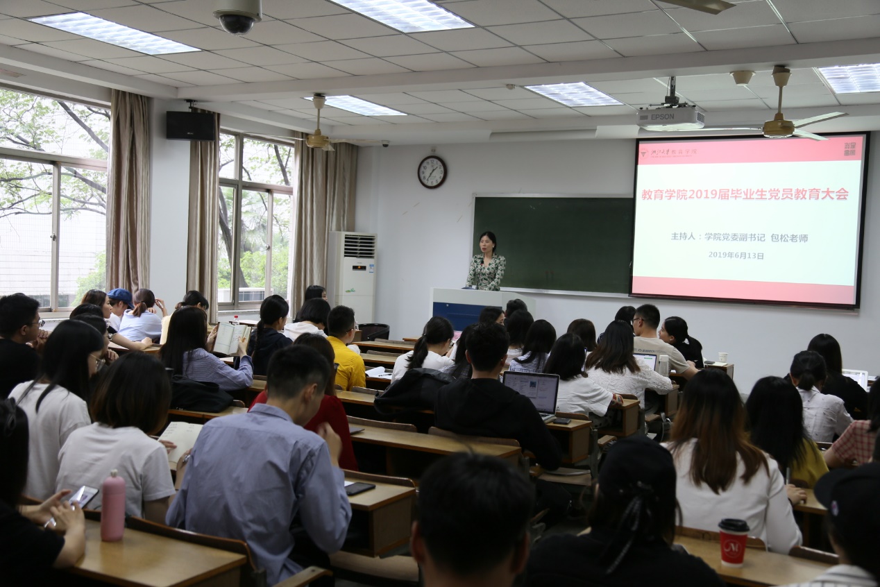 2019年6月13日下午,在毕业生离校之际,教育学院召开了2019届毕业生党员教育大会。其由教育学院党委副书记包松老师主持,教育学院党委书记吴巨慧老师,组织人事科巫微涟老师、团委张静波老师和蒋闰婧老师及学院全体毕业生党员共同参加了本次会议。