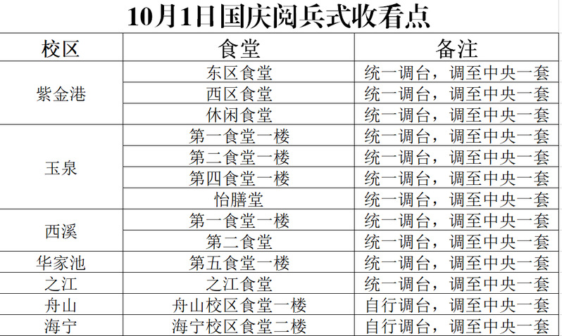 请各党团组织结合学习工作实际,及时组织安排党员、团员及广大青年观看,并就所思所想积极展开线上和线下讨论。届时,我校将在各校区食堂对此次阅兵仪式进行转播,具体收看点安排如下,同学们可以自行前往观看。