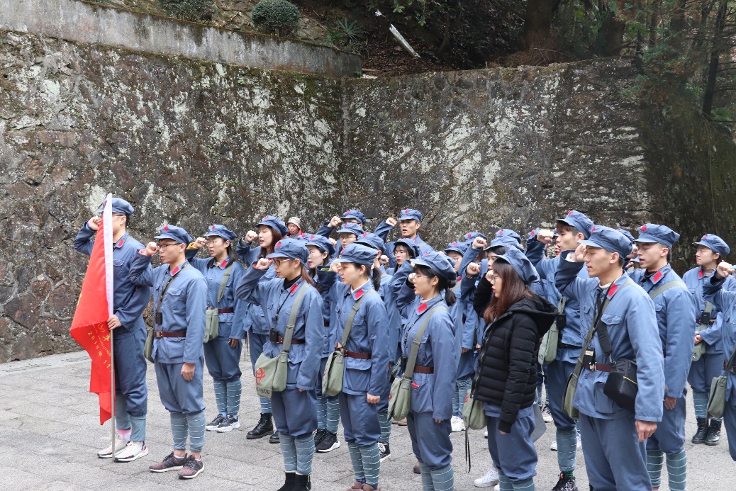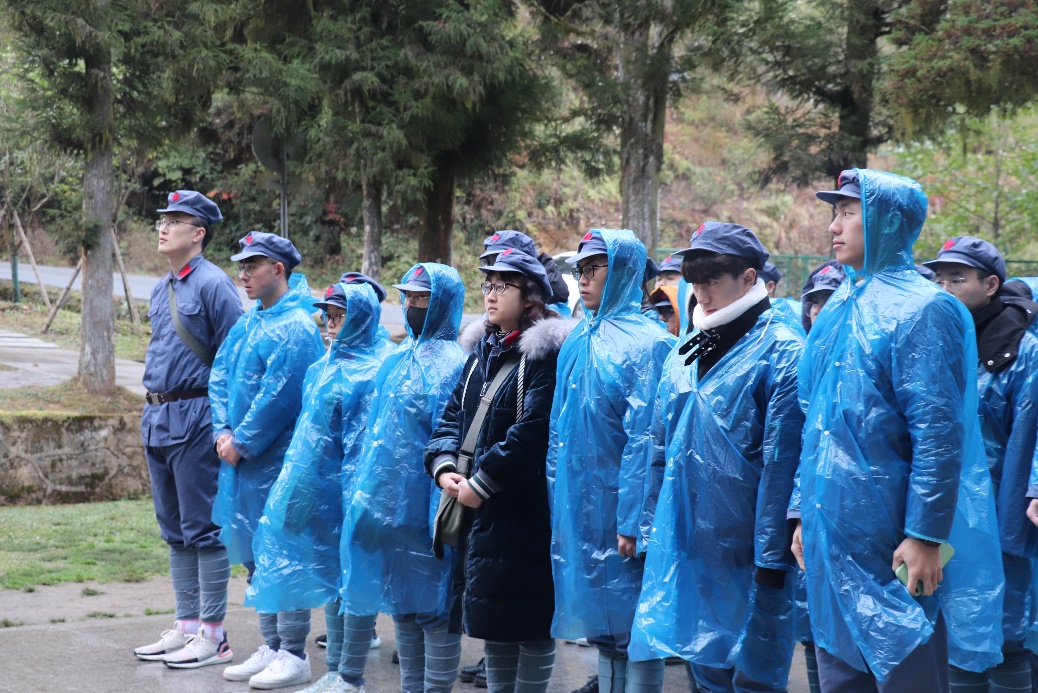 次日清晨,培训班开展了“重走红军路”活动。虽然井冈山上下起了绵绵细雨,气温也接近零度。但同学们仍然坚持身着红军服,腰挎红军包,在黄洋界寒冷的户外聆听革命传统学院讲师的现场教学。时间虽短,但那刺骨的严寒书写着当年红军战士行军之艰难;历史仍近,黄洋界不息的“旌旗在望,鼓角相闻”也久久回荡在同学们的心间。