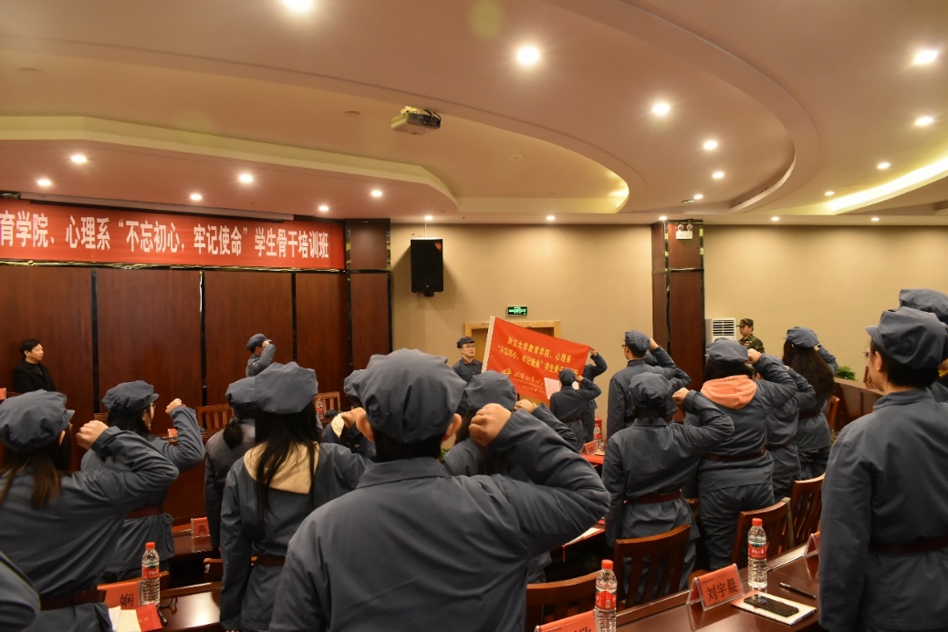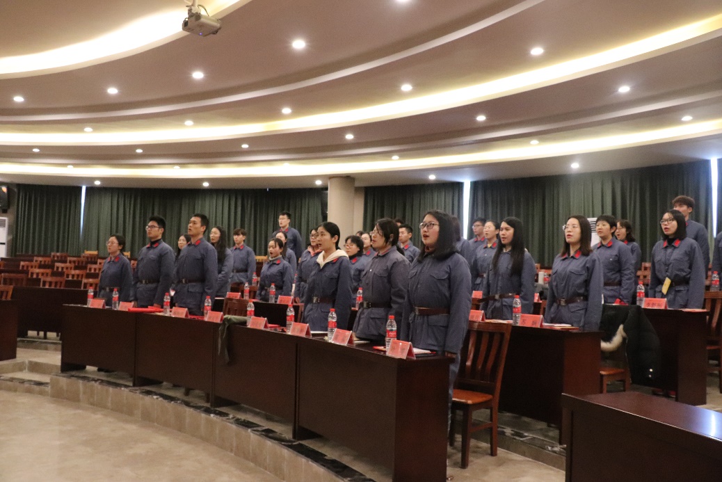 井冈山革命传统学院副院长贺庆明在开幕式上对同学们的到来表示了热烈欢迎,并向同学们介绍了井冈山的地理人文以及发展历史,让同学们对慕名已久的革命圣地有了初步的认识和了解。而后,进行的唱国歌、授军帽和队旗的仪式,正式拉开本次红色培训的序幕。
