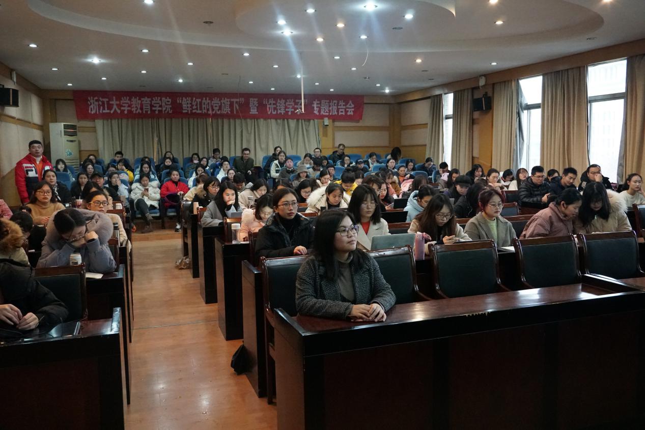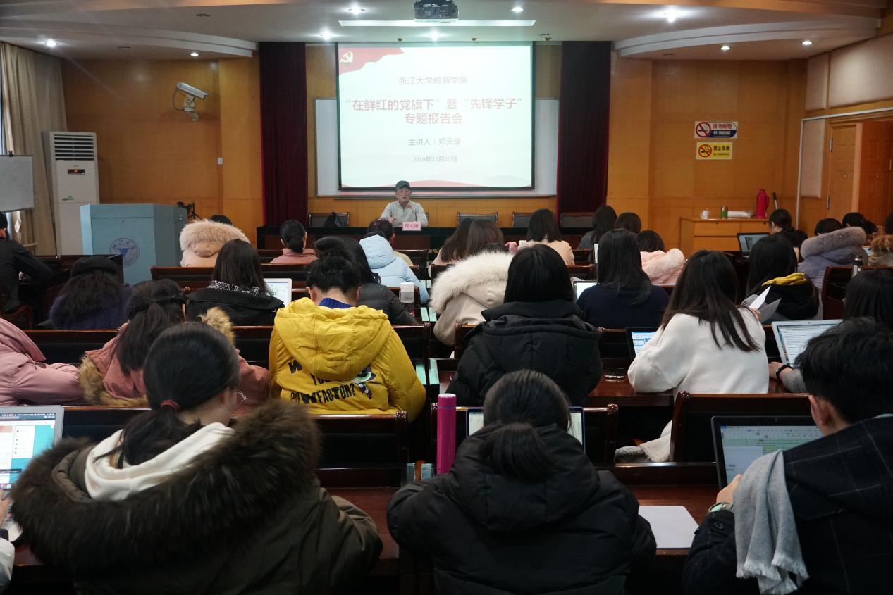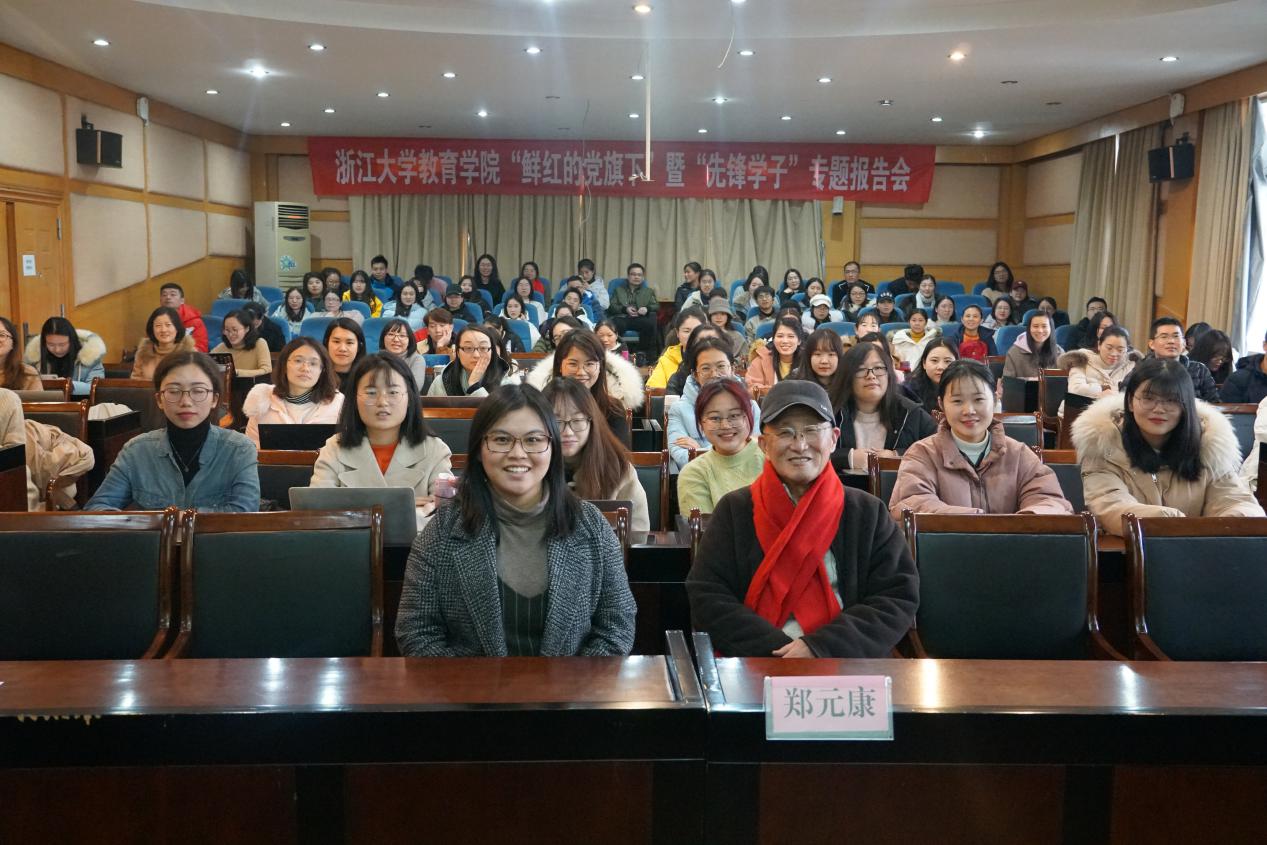 为深入学习贯彻十九届四中全会精神,进一步深入学习领会习近平总书记关于“不忘初心、牢记使命”主题教育的重要讲话精神,进一步学习贯彻习总书记关于教育的重要论述和对浙江大学系列重要指示精神,浙江大学教育学院于12月20日下午在田家炳书院520报告厅“在鲜红的党旗下”暨“先锋学子”专题报告会。报告会邀请到88岁高龄的郑元康教授,为学院全体学生党员和部分入党积极分子分享如何做一名合格的共产党员。会议由学院团委蒋闰婧老师主持。