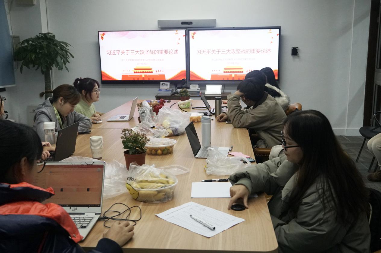 为深入学习贯彻十九届四中全会精神,进一步深入学习领会习近平总书记在指导开展“不忘初心、牢记使命”主题教育时的重要讲话精神,学习贯彻习近平总书记关于教育的重要论述和对浙江大学系列重要指示精神,教育学院教育学科研究生第三党支部于12月20日晚在西六教学楼316会议室开展了“决胜2019,共盼2020”主题党日活动。活动由教研三支部书记蒋闰婧主持,支部党员同志及入党积极分子共同参与。