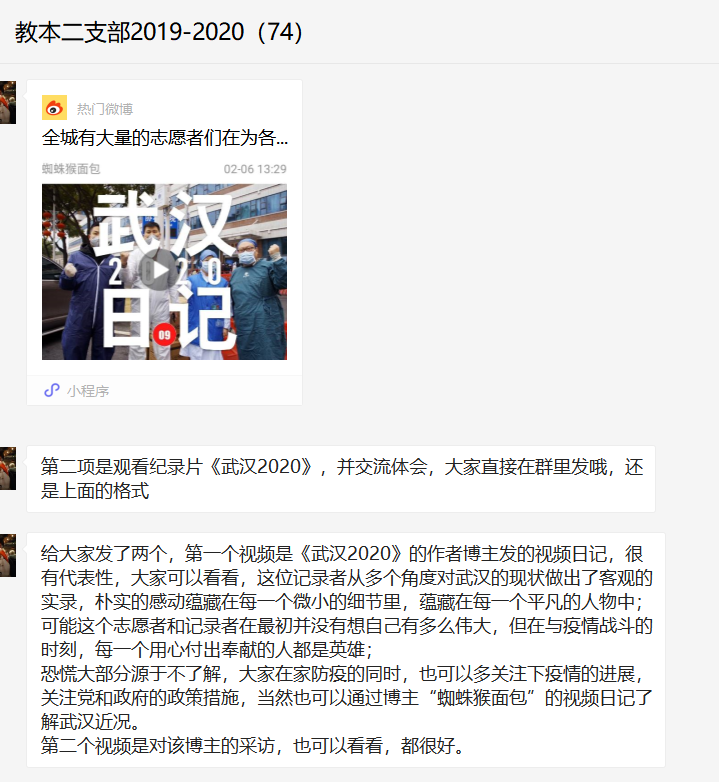 教育学科本科生第二党支部通过纪录片《武汉2020》中对武汉现状的多角度客观实录,了解了武汉全城各行各业为抗击疫情所做的贡献,感受到蕴藏在每一个微小细节里和每一个平凡人物身上的朴实与执着,真正体会到习近平总书记所说“伟大出自平凡,平凡造就伟大”的深刻内涵。