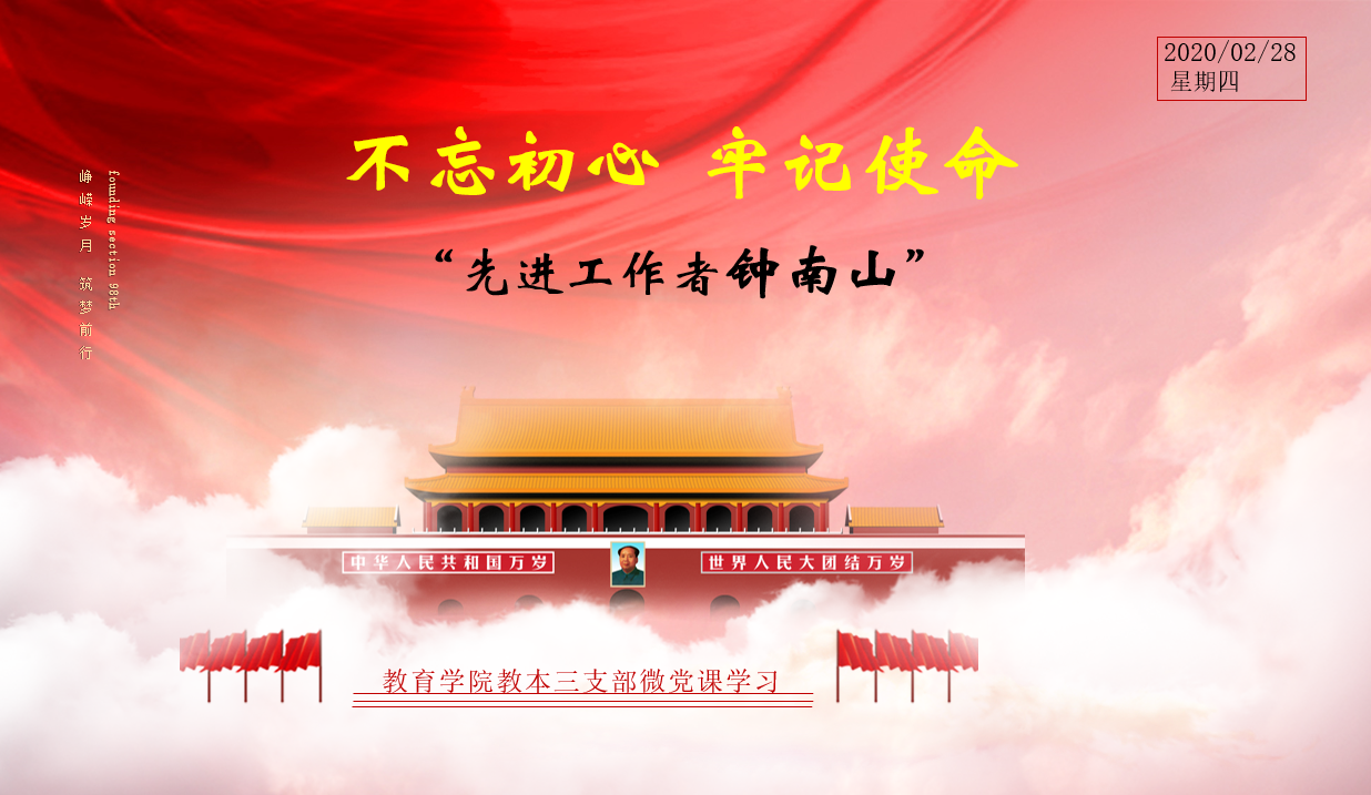 教育学科本科生第三党支部李艳同志作题为《先进工作者钟南山》的“微党课”,了解终南山院士的先进事迹,学习他的对党忠诚的崇高品质,鞠躬尽瘁的敬业奉献精神,把科学当作毕生追求的探索精神,尊重事实甚于尊重权威的求实精神,心系群众、务实为民的真挚情怀,以及严于律已、宽以待人的博爱精神。教育学科研究生第一党支部陈金慧同志分享了“从《中国社会各阶级的分析》到‘农村包围城市’”微党课,呼吁党员同志全面贯彻党中央的重要指示,并不断用新思想武装头脑,不忘初心、牢记使命,以必胜决心支援战“疫”,以昂扬斗志为学校的“双一流”建设努力,为全面建成小康社会贡献青春力量。
