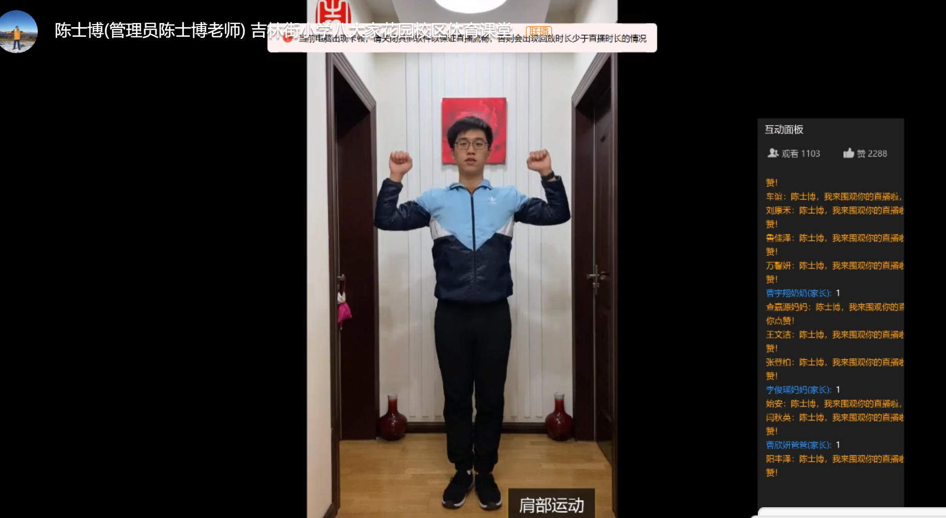 2月10日,陈士博作为“主播”的第一堂体育课结束后,家长与孩子们对课程连连点赞。“太棒了,好久没有这样出汗了,把坏心情都给赶跑了”“不愧是孩子们喜欢的体育老师,真希望每天都由老师带着大家动起来”,像这样的反馈还有很多,家长与孩子们不约而同的为线上体育课点赞。