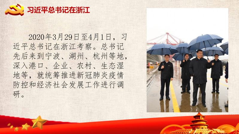 支部党员李青阳同学作“习近平总书记浙江行”主题微党课。他从六个方面向大家介绍了习总书记在浙江考察之行的要点。一是港口对于当前经济形势的重要影响,二是对中小型民营制造业企业的关注、三是总书记重回“两山论”发祥地看变化、四是走访西溪湿地看保护湿地原生态的重要性、五是杭州健康码等智能现代化方式让城市更聪明智慧、六是总书记听取浙江省委报告并在疫情防控、经济发展、公共卫生、城乡协调发展、党的建设五个问题上做进一步指示。