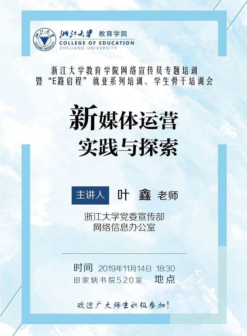 教育学院关于举办网络宣传员专题培训、学生骨干培训暨“E路启程”就业系列培训活动的通知 | 新媒体运营实践与探索
